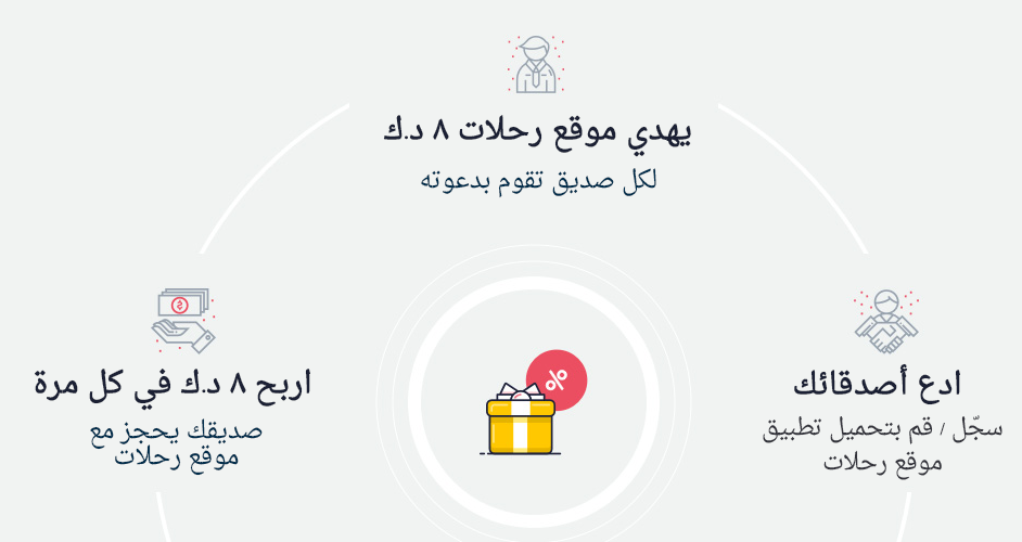 دعوة الأصدقاء: قم بمشاركة رابط الدعوة، وادع أصدقاءك للانضمام إلى موقع "رحلات" واحصل على رصيد كرم عندما يحجزون عليه، وهم أيضًا يحصلون على رصيد كرم فور تسجيلهم.